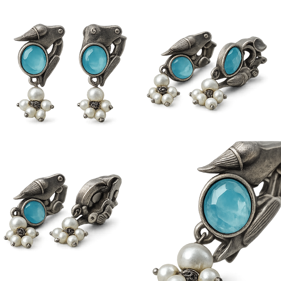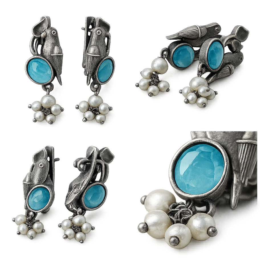 Featuring parrot-shaped motifs in multiple colours accented with pearl detailing, this coordinated set adds playful elegance to festive looks.